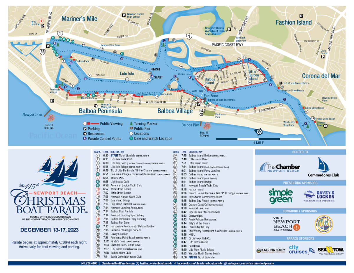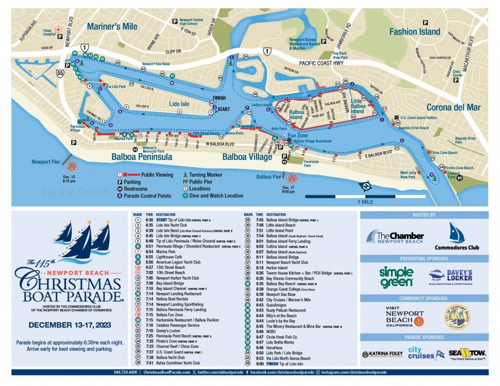 As the 115th Newport Beach Christmas Boat Parade moves its way through the Newport Harbor this December, the Newport Beach Christmas Boat Parade Committee, with the leadership of The Commodores Club of the Newport Beach Chamber of Commerce, will continue with its parade route starting and ending point at Tip of Lido Isle. The parade will begin at approximately 6:30 p.m. each night from December 13 – 17, 2023.